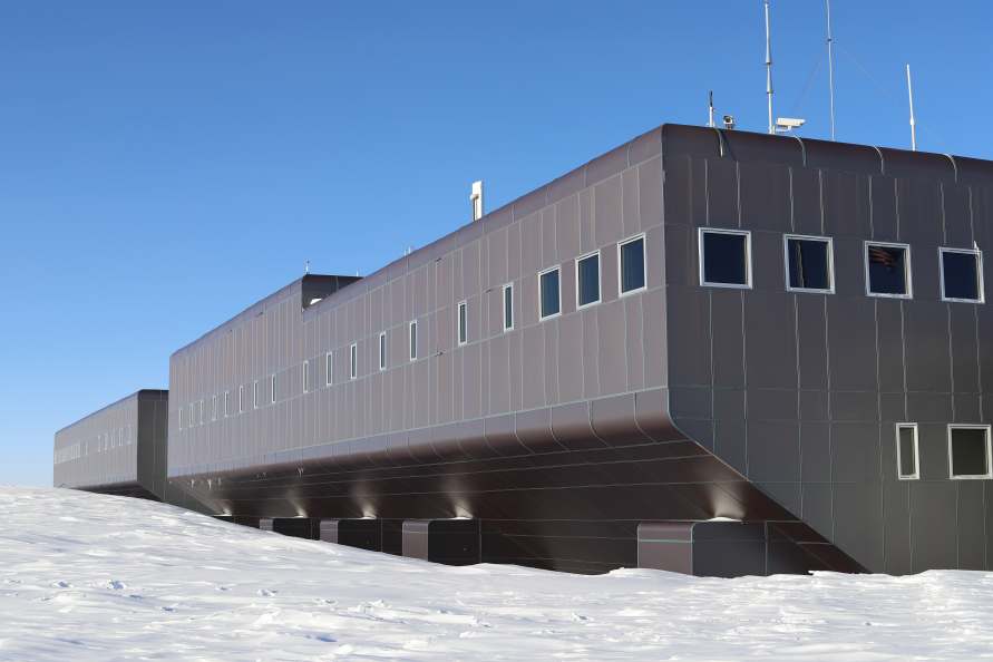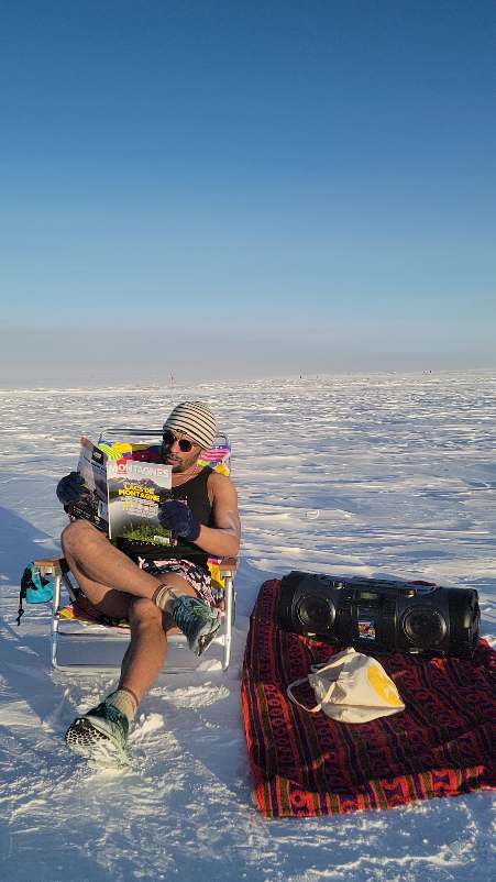 Sometimes it’s just plain quiet at the Pole. It’s summer, the sun’s out, and the temperatures are…well, let’s just say it’s cold. Above is a nice view of the South Pole station on a sunny day. And below is IceCube winterover Celas, whose remaining days at the Pole are numbered, taking advantage of the sun to relax and read a book outdoors—sleeveless and in shorts still doesn’t mean it’s warm though.
