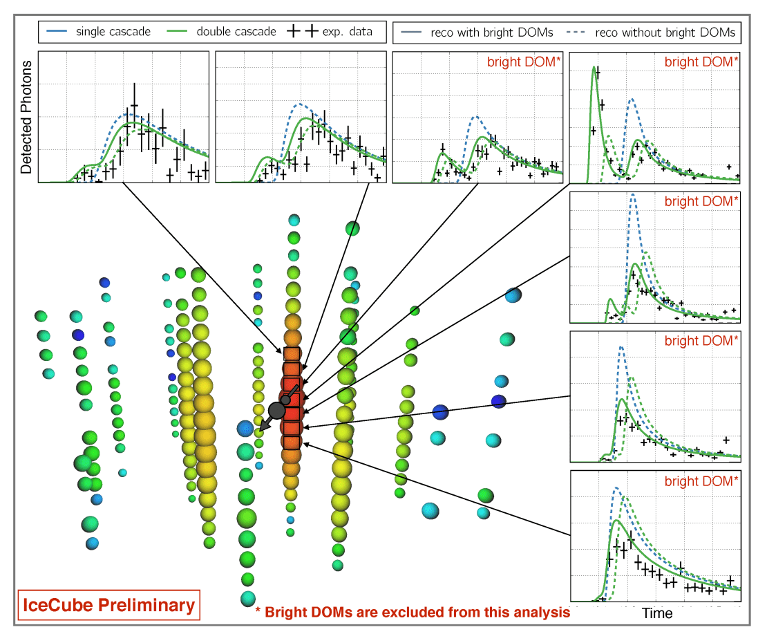 But now a double cascade has been observed in IceCube for the first time. This Double Double event, as it has been dubbed, has an energy of about 100 TeV and is reconstructed as exactly two energy depositions (indicative of a tau neutrino) some 17 meters apart. The few sensors closest to the interaction point captured two light peaks separated in time. This light is produced by the rapid movement of high-energy particles that travel faster than light in the ice and create a cone of blue light called Cherenkov radiation—much like a sonic boom, but with light instead of sound.