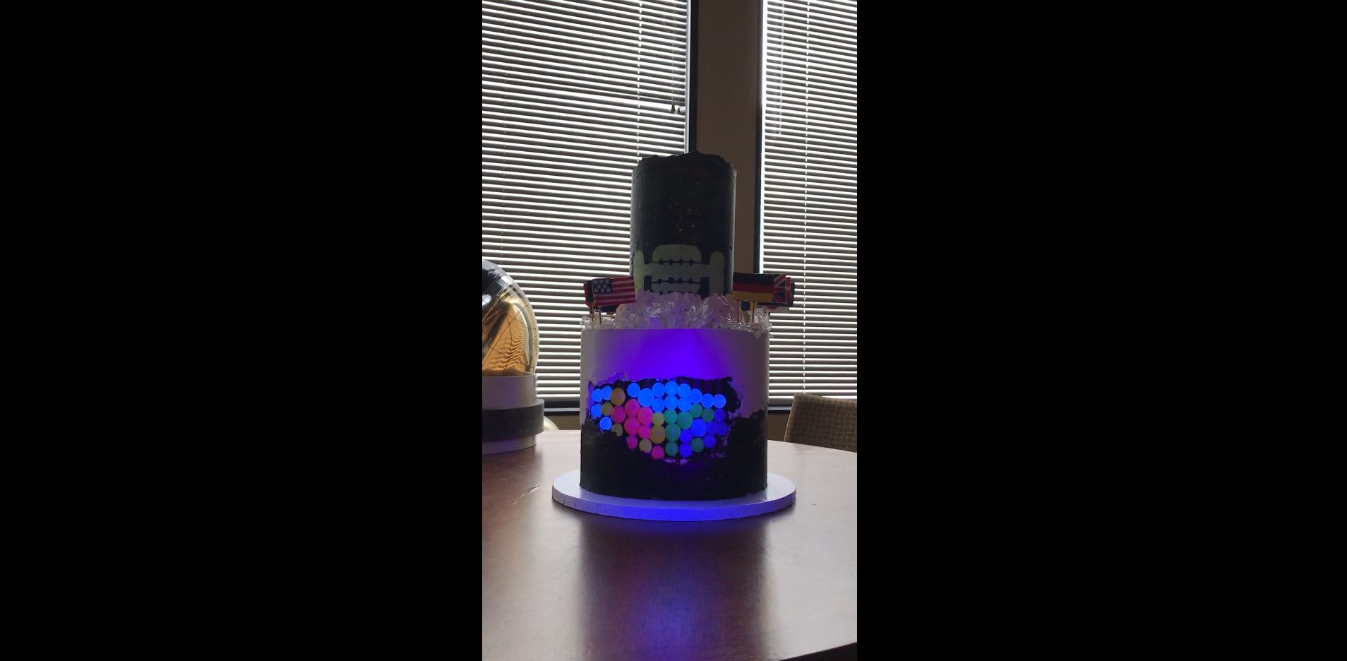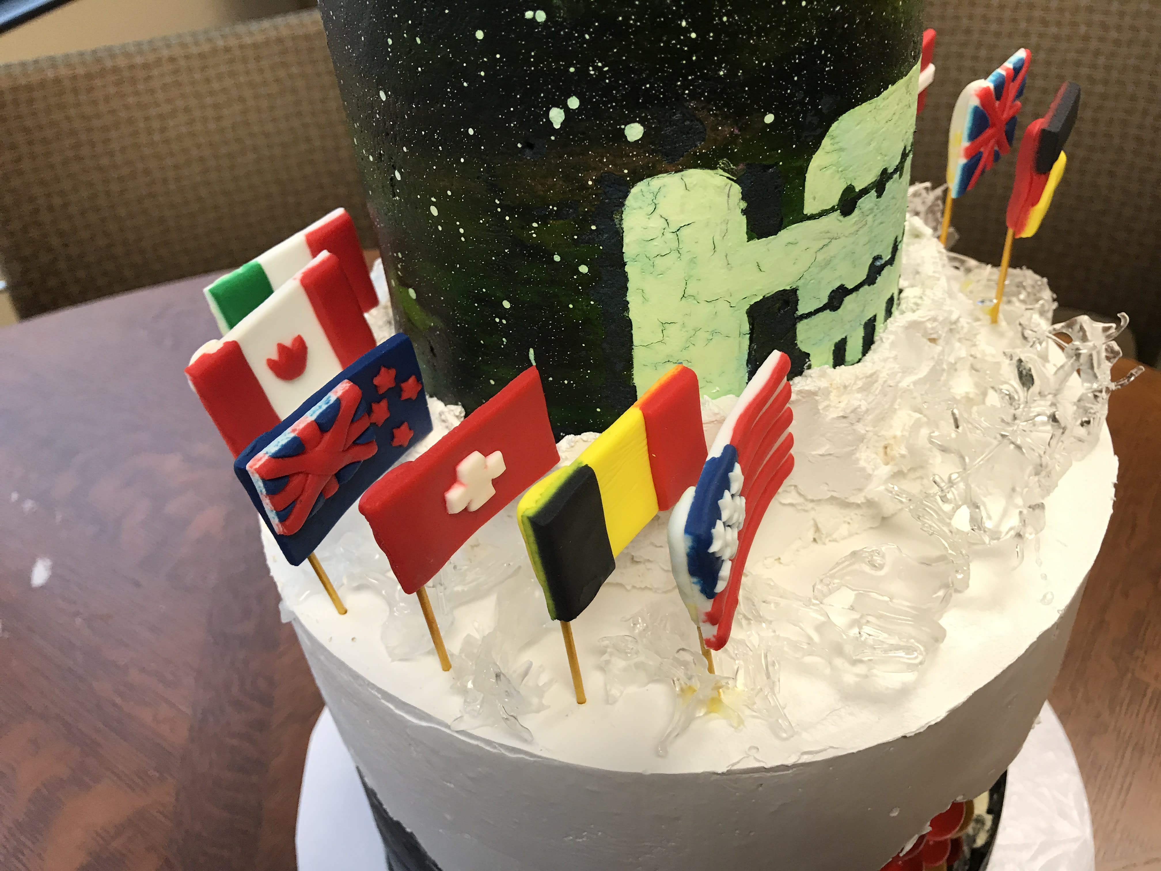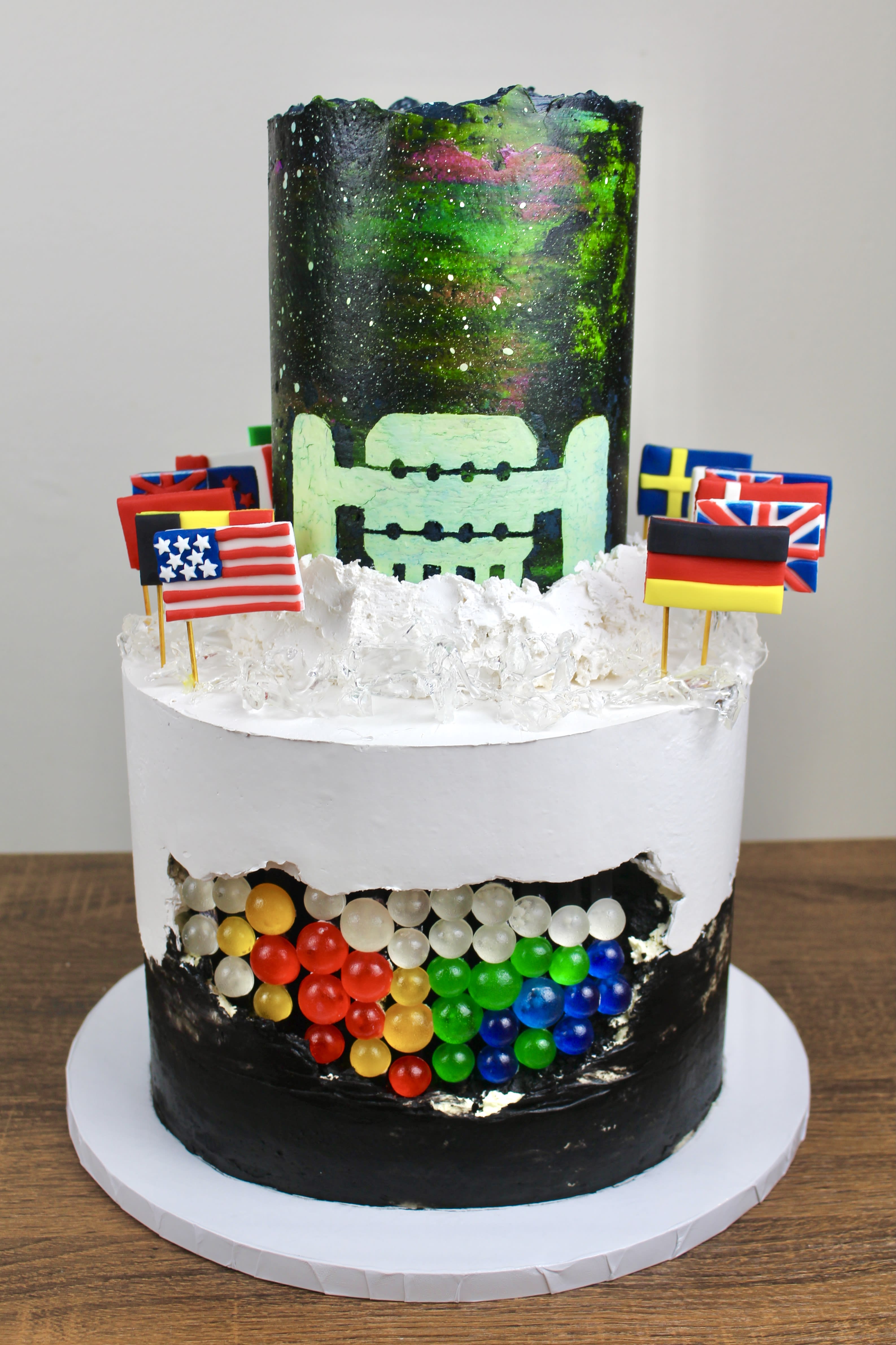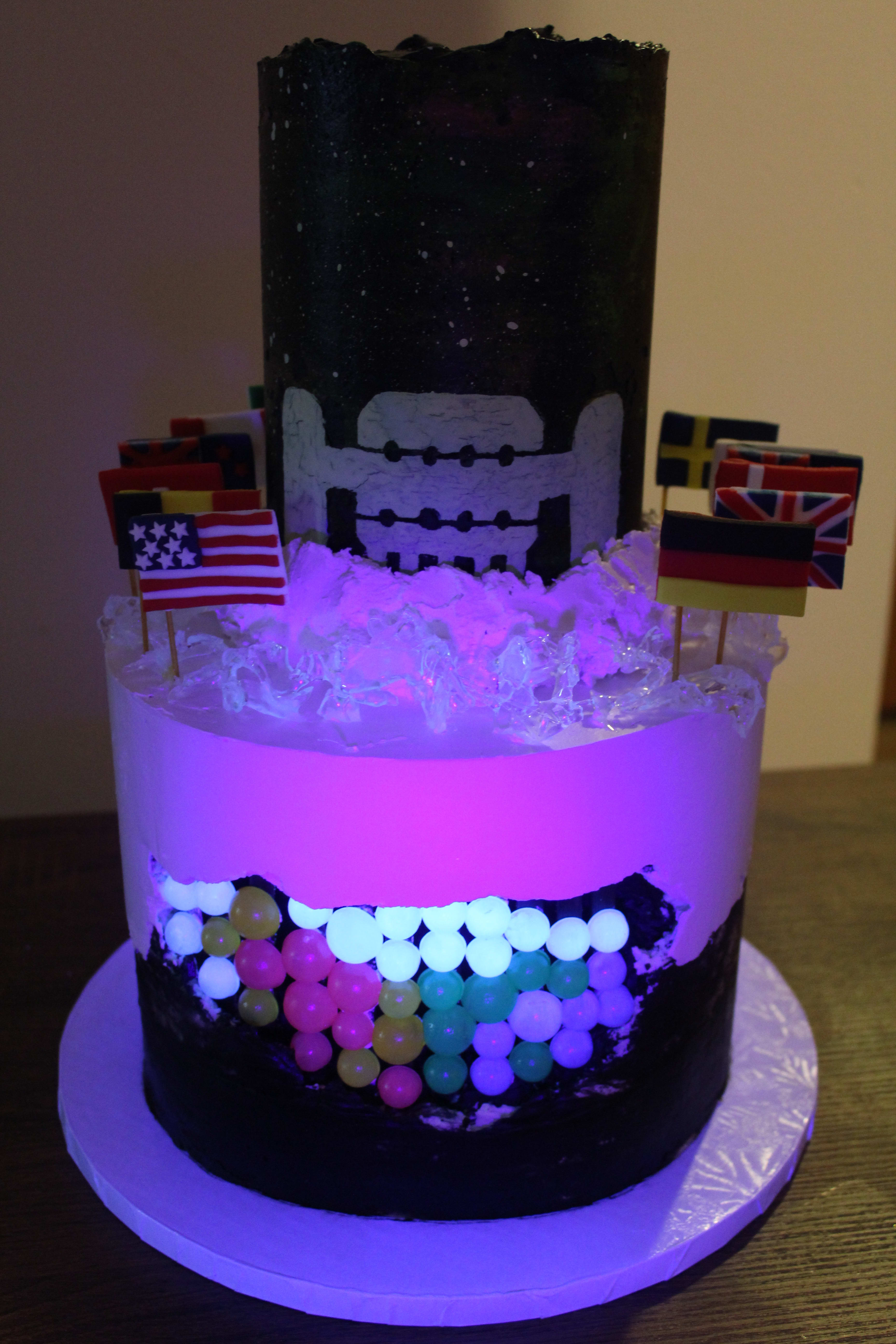 The top tier is chocolate with nutella fudge and is decorated with a star- and aurora-filled night sky and the IceCube Laboratory. The bottom tier, which is funfetti with cream cheese frosting, is topped with an “icy” isomalt surface and fondant flags representing the countries that are represented in the IceCube Collaboration. Embedded in the bottom layer are gummy “DOMs” that glow under black light!