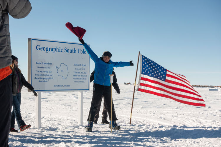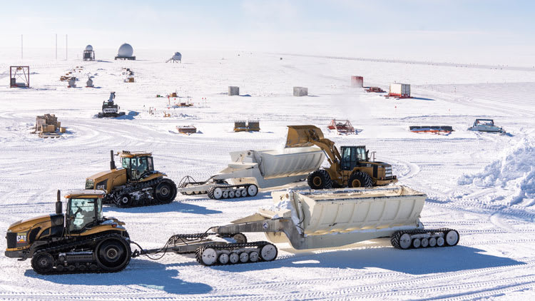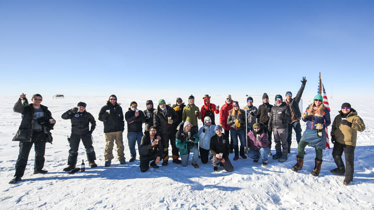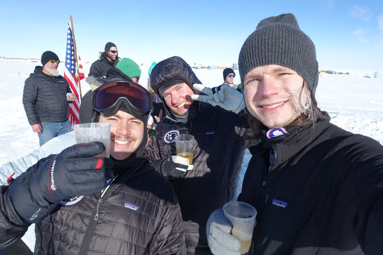 Besides installing the new the pole marker, last week involved celebrating and toasting in general. All three of IceCube’s winterovers currently at the Pole toasted and smiled for the camera, followed by a celebratory group shot. There was also some detector troubleshooting, an incoming plane bearing cargo and mail packages, snow moving (which provided some fun (and safety-approved) sledding), and a trip to the “End of the World” (just a place where all the removed snow gets dumped because it’s downwind from the station).