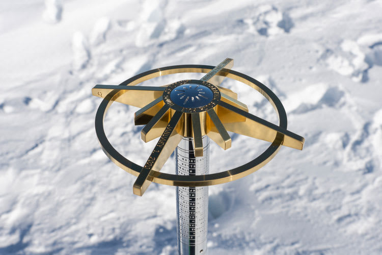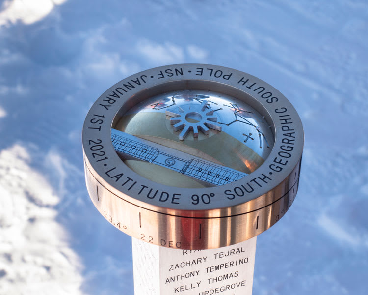 Like other places around the world, the South Pole has its traditions for ringing in the new year, but some of them are unique to this locale. For example, each year they hold a ceremony at the geographic pole to set a new pole marker into place. The exact location of the geographic pole shifts somewhat each year due to ice movement. The beginning of the year is as good a time as any to reset the position—so why not take the opportunity to install a brand new marker? The image above shows the new marker for 2021, while below we see the outgoing 2020 marker (and a different view seen here). The pole markers are traditionally designed and manufactured by one of the previous year’s winterovers, who normally will have left the Pole before the new year begins. But not this year—that’s Geoffrey Chen, this year’s pole marker designer but one of last year’s winterovers who are still at the Pole, excited to do the unveiling.