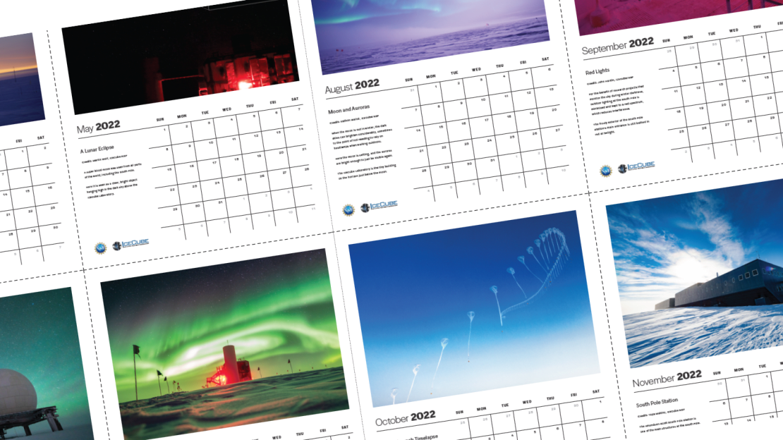 It’s almost the new year, which means it’s time for the 2022 IceCube Calendar! Featuring breathtaking photos taken by our winterovers from the past few years, this calendar will teach you something new about the IceCube Neutrino Observatory and the South Pole every month.