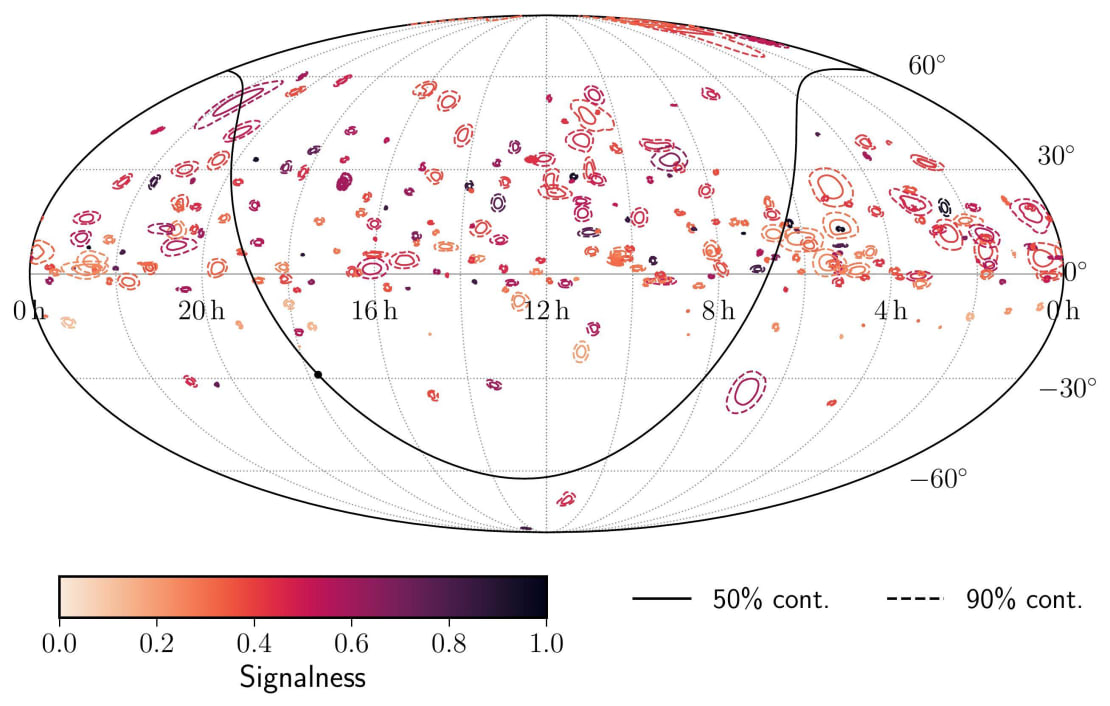 Map of high-energy neutrino candidates (“alert events”) detected by IceCube. The map is in celestial coordinates, with the Galactic plane indicated by a line and the Galactic center by a dot. Two contours are shown for each event, for 50% and 90% confidence in the localization on the sky. The color scale shows the “signalness” of each event, which quantifies the likelihood that each event is an astrophysical neutrino rather than a background event from Earth’s atmosphere. Credit: IceCube Collaboration